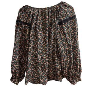 Old Navy long-sleeve blouse in size XL, featuring a green base with small peach & yellow floral “ditzy” print, contrast black lace-yoke detail at the chest, classic button front and relaxed peasant style. Soft cotton-viscose blend and boho-cottage-core vibe — great for casual wear, layering under a cardigan or pairing with high-waisted jeans.