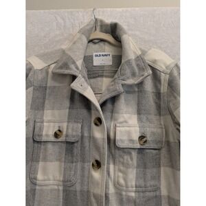 Keywords: Old Navy, Womens, Shirt Jacket, Shacket, Plaid, Buffalo Plaid, Gray, White, Casual, Fall, Winter, Button Down, Long Sleeve, Size S