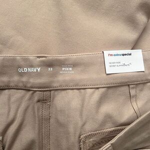 Introducing the Old Navy Women's High Rise Pixie Never Fade Secret Slim Pockets in Nude, Size 22. These pants are designed to fit and flatter your curves with a high-rise waist and a slimming effect. The Never Fade technology ensures that the color stays true wash after wash, while the Secret Slim Pockets provide a sleek look without sacrificing functionality. Perfect for any occasion, these pants are a must-have addition to your wardrobe.