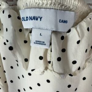 Old Navy Women's Cream Ivory Black Dot Ruffle Detail Cami Dress Size Large. Shell 100%Rayon, Lining 100%Polyester. Approx. measurements pit to pit 15.5 in. Waist 29 in. Dress length 39 in. Pre-owned in good condition, no holes or stain.