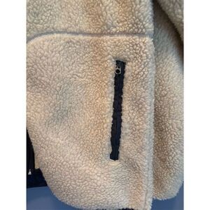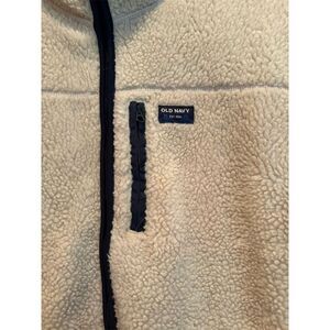 Keywords: Old Navy, women's jacket, fleece, large, cream, navy, casual, fall, zip closure, long sleeve, multicolor, mid-length, machine washable, pre-owned.