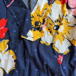 Color pop! This vibrant top from Old Navy, size Medium, is sleeveless, V neck, has a tie front, with big flowers in pinks and yellow on a navy background. Light blue polka dots are also in the background. Bottom hem is curved, length is 26", chest measurement (pit-to-pit) is 21". Cute top will match lots of bottoms. In great condition.