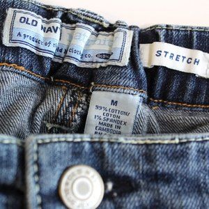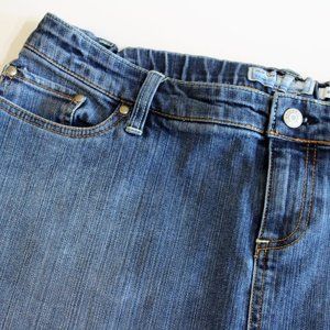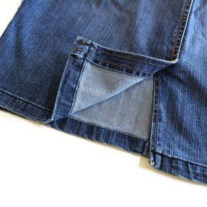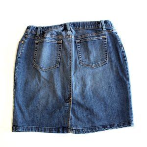 This denim skirt is medium wash with a straight cut. It is approximately knee length of slightly above depending on height. The skirt has a flat front with a zipper entry and front pockets. The back of the skirt has an elastic waist, back pockets and a slit opening. The skirt has belt loops. It is in excellent used condition.