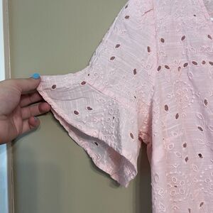 Old Navy Womens Pink Eyelet Cotton Blend Button Up Short Flutter Sleeve Medium. Excellent used condition. Light baby pink with eyelet embroidery. Perfect color for summer! Unlined so it does show through. Short sleeve with flutter/ruffle sleeve. Cotton/rayon blend material. V-neck and buttons up all the way down. Buttons have loop closure. Does not have much stretch. All items from smoke free, pet friendly home. Open to offers and bundle for a discount!