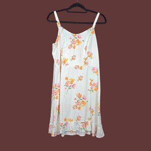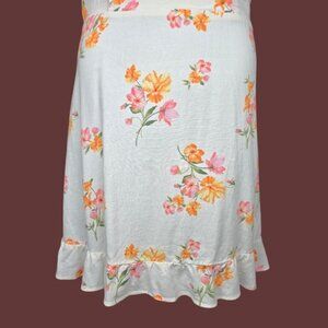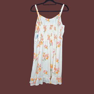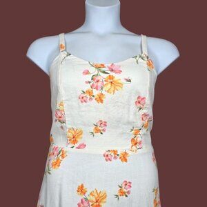 Old Navy floral print linen blend cami dress in off white, pink, and orange. Lined bodice. Smocked panel on back. Adjustable straps. Ruffled hem. Linen rayon blend. No stains or holes. Casual spring summer floral linen dress.