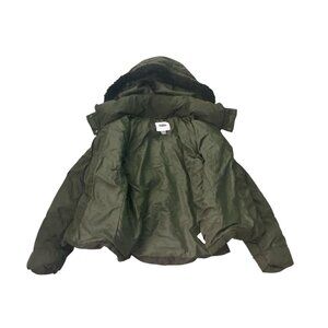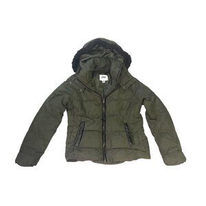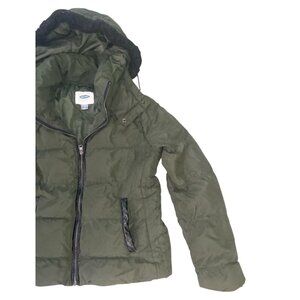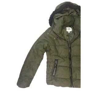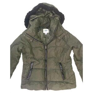 Old Navy Women’s Puffer Jacket Small Green Hooded Faux Fur Trim Winter Coat