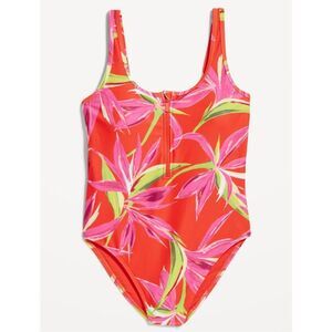 Old Navy red floral half zip one piece swimsuit sz L beachy pool vacation