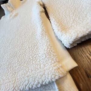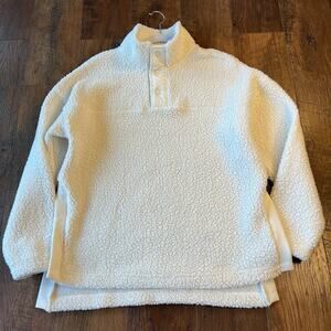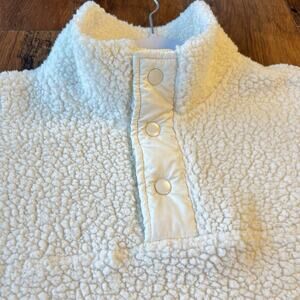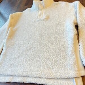 Cozy sherpa fleece pullover in women’s size small (unisex-friendly fit). Made from soft 100% polyester sherpa fleece with a plush texture for ultimate comfort and warmth. Features a snap-button half placket, high collar, ribbed side panels, and relaxed fit. Classic white/cream color makes it versatile for layering. Perfect for fall, winter, outdoor adventures, loungewear, or casual everyday wear.