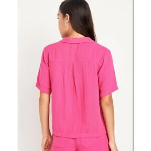 • This fuchsia short-sleeve blouse from Old Navy blends comfort with vibrant style. Made from a soft, gauze cotton fabric, it offers a breezy, relaxed fit ideal for warm weather or laid-back days.