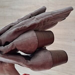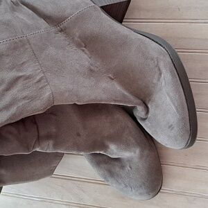Well loved, worn boot. Soft suede, tall, chuncky heeled, taupe color knee boots. Slip on. 2.5" heel. Does have some staining. See pictures.