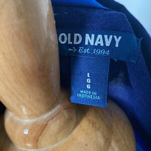 Old Navy Women’s blouse navy blue, medium blue and green. Collar with 5 buttons that go half way down front. Long sleeves that can be buttoned up. Chest pockets. Sz large. NWT