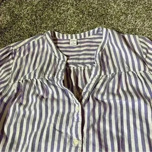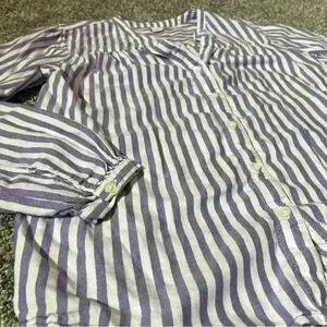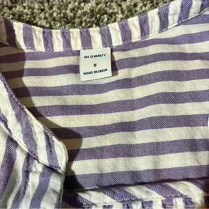 This Old Navy women's blouse in size S features a stylish purple and white striped pattern, perfect for a casual occasion. The long sleeves and V-neckline add a touch of elegance to the design, while the button closure provides a practical detail. Made of a blend of rayon, cotton, and Lycocell, this blouse is comfortable and breathable, suitable for all seasons.