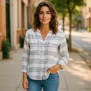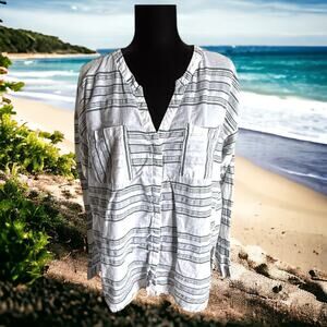 Old Navy Womens Tunic Sz L Gray White Striped Semi Sheer Beach Shirt Blouse