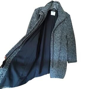 Chic Old Navy tweed overcoat in Black Marl with subtle silver hardware. Features a funnel neck, zip front closure, and slip pockets. Fully lined for warmth and structure. A classic Preppy-meets-Minimalist style perfect for fall and winter layering — pairs beautifully with denim, trousers, or a turtleneck.
