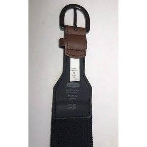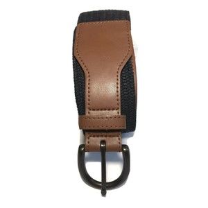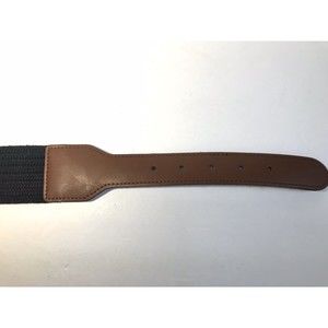 This listing is for a preowned Old Navy women's woven stretch wide waist belt in black with tan faux leather trim in size M/L. The buckle is a bronze color. It measures about 2" wide, and about 36" long, not including the buckle. It is preowned but in great condition. Please see the photos for more information and detail.