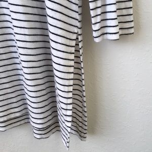 Black and white striped, quarter length sleeve, long, tee from old navy. Has slits in the sides. Super comfortable and flattering for layering under vests.