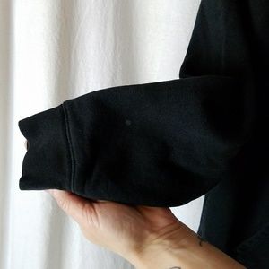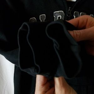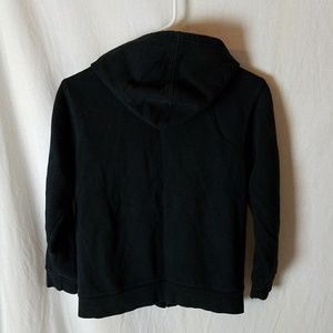 This jacket has a hood and the zipper works perfectly. There is a small stain on the sleeve. Much loved and well worn, but someone else could still love it.