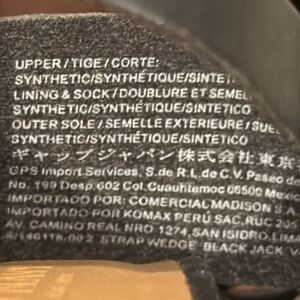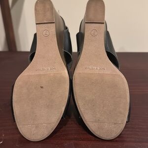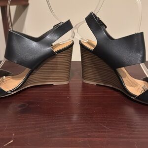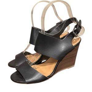 Very gently preowned in great shape. They have a brown stacked wedge heel and wide black straps that buckle at the ankle.