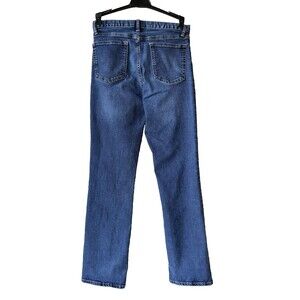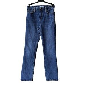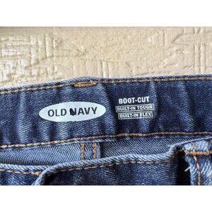 Old Navy big boy's Navy Blue Built-In Tough Built-In Flex Bootcut Adjustable Waist Cotton Blend Denim Jeans, size 18 x 31 inch inseam, zipper with button closure, 5-pocket design.