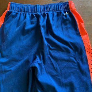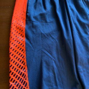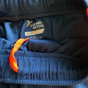 These can be worn by guys or gals, dark blue with orange stripes on sides. Size L (14-16), in good condition, elastic and drawstring waist.