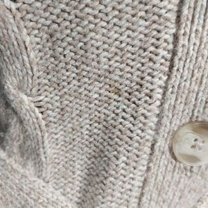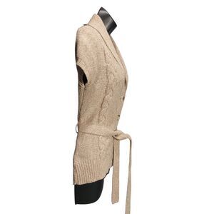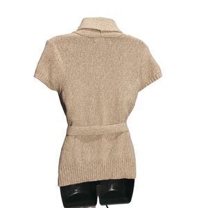 Gently used Old Navy button down belted short sleeve sweater size small. There is 1 tiny spot as shown and very light piling on the back shoulders. Measures 16" pit to pit, 12" Sleeve and 26" hemline. Comes from a smoke free and pet friendly home.