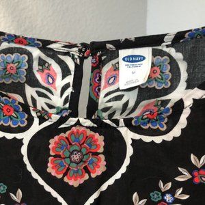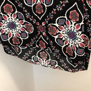 Short sleeve blouse has keyhole and button closure at the back. It's black with a bold and colorful graphic print (green, red, blue, white, pink, beige). 100% rayon has a soft, flowy feel, but not it's a stretchy fabric. Size M; 19" pit-to-pit. Top is asymmetric; 25" in front and back is 28" long. NWOT; never worn.