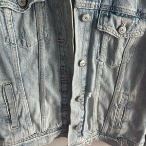 Stylish sky blue denim jacket. Features classic button design. Perfect for casual wear.