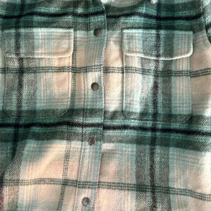 This can be one as a lightweight jacket or a heavyweight shirt. It has pockets! It also has snaps. The chest is 42 inches. The length is 28 inches. There are no flaws.
