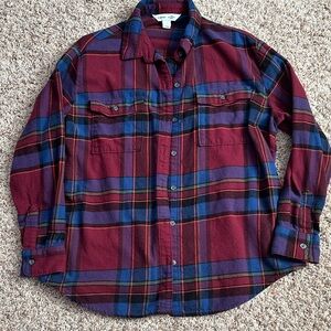 Euc, Old Navy boyfriend flannel shirt, button down. Burgundy, blue, olive green, orange, black colors. Length from shoulder to bottom is approx 28” and armpit to armpit is approx 21”