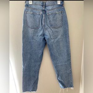 worn. Very good quality denim. not stretchy. may not be good if you have a big butt (being honest). good length (im 5’9). Straight leg.