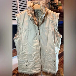Womens Old Navy, reversible, faux fur lined vest. You can wear it as a fur vest or the utility look vest. Very warm. Sleeveless. Full zip up front. Pop/stand up collar. 2-slip in, front pockets. Great vest to keep warm this fall/winter. Very good, used condition.