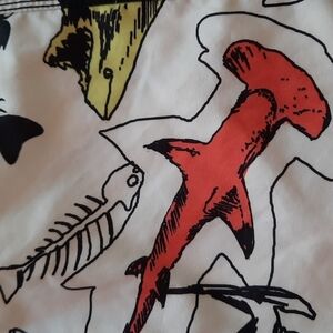 Old Navy size large 10 12 shark print swim boardshorts. Has mesh liner inside. Very good pre-owned condition. Smoke free pet friendly home. Please see pictures for measurements. Boardshorts shark print swim 10 12 large Old Navy