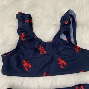 Old Navy lobster print two piece Swimsuit. I envision this suit on a beach in Maine or Cape Cod - navy blue with red lobster print. Ruffle accents. Very good used condition!