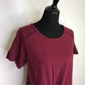 Old Navy maroon tie front burnout top. Pullover style with round neckline. Short sleeves. Ties at front hemline. Eyelet trim. Size Large. Excellent preowned condition. Machine wash.