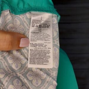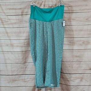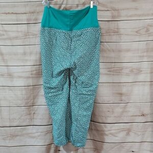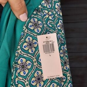 Old Navy maternity pants in Tiled Green which is teal/sea green with tile pattern in black/blue/white/yellow, size L.