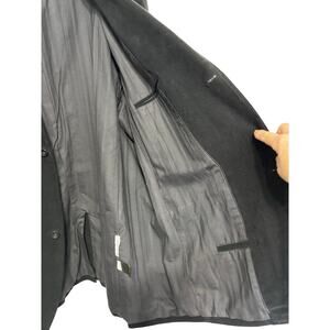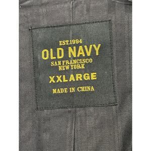 There’s Old Navy two XL black 100% cotton blazer feels like suede. It has two button closure and two front pockets. It has one inside pocket. It is lined. It has one vent in the back and is an excellent shape.