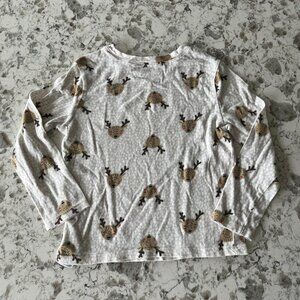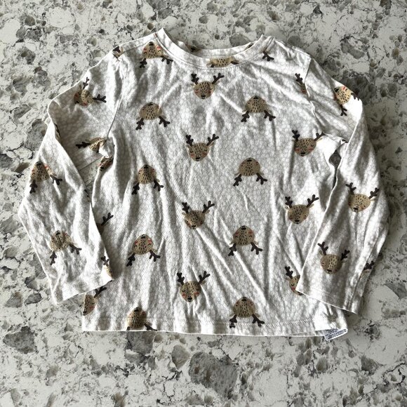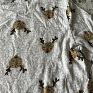 Ecru snowballs on a light cocoa background with sweet little reindeer faces throughout.