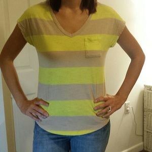 Neon yellow and tan striped t-shirt with front pocket. Fits loosely.