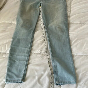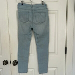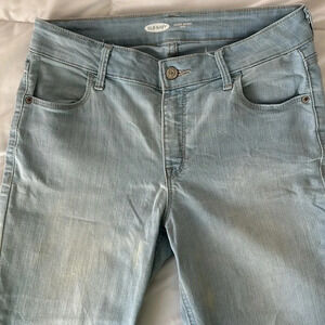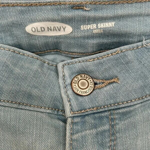 These are a denim light wash Old Navy jeans in a size 6. Machine wash cold. 78% cotton 20% polyester 2% percent spandex.