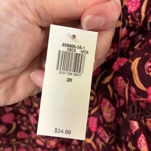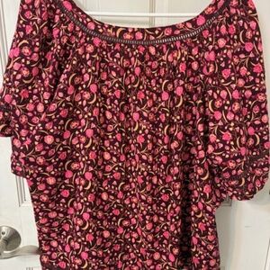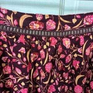 Maroon/pink floral pint, short sleeves, slight v neck, decorated trim on sleeves, waist and neckline.