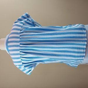 Old Navy XS light blue and white striped button down collared cap and cuffed sleeves gathered back side vents high-low straight hem