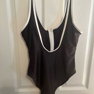 Stylish one-piece swimsuit. Features a front zipper. Contrasting white trim.