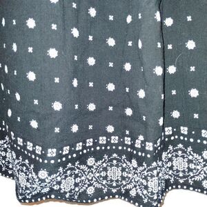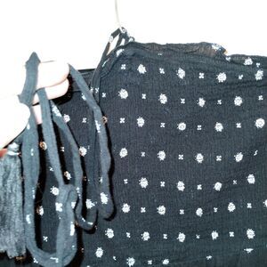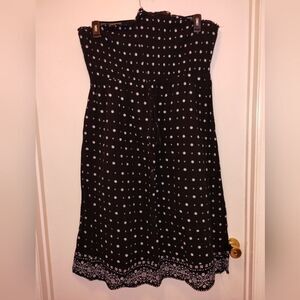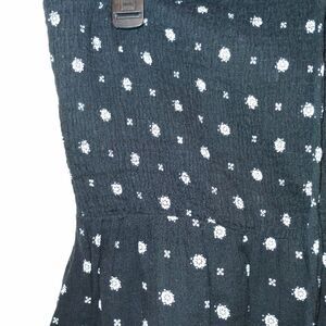 Cute black sun dress that has a tie in the front, you can make a bow or tie it around your neck. Elastic (shows some signs of use) is at the top of the dress and in the bodice area so it will hold the dress up the tie is not necessary but it does look cute when it's tied dress is a midi still has lots of life left