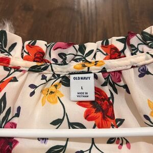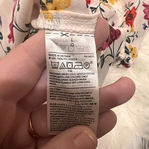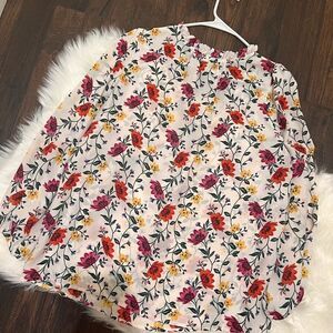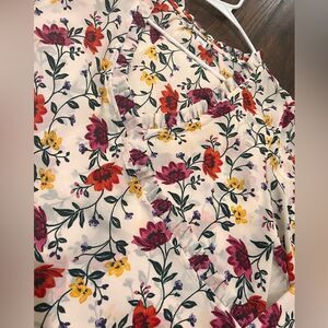 White with orange, fuschia, purple,pink and yellow florals with green vines. Ruffle detail around the neckline and a faux wrap look at the chest. Thin lightweight fabric, semi sheer, doesn't stretch. Elastic at the wrist. Great condition. I would say this is an oversized fit and could fit an XL as well.
