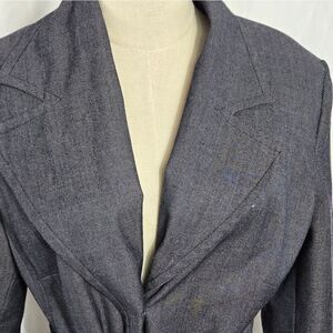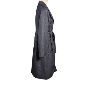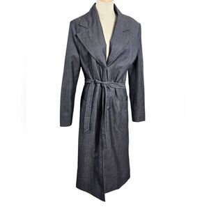 Amazing Trench with a Denim look to it. Like a gray blue color. Something different than a regular tan color. Fully lined. Good overall condition Has pockets