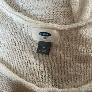 Old Navy lightweight knit top, ivory, size M. Rolled round neck with small cap sleeves. Oversized fit, notched sides. Approximate measurements are pit to pit flat 30”, length from shoulder approximately 27”.