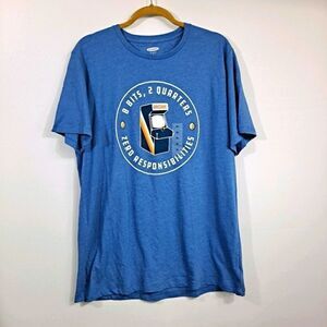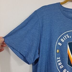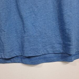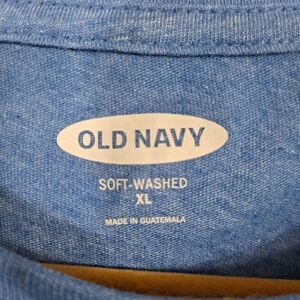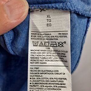 Medium blue with blue and white graphic, size XL. Round neck, short sleeves, cotton, polyester blend. Chest 48", length 30".