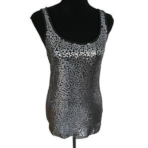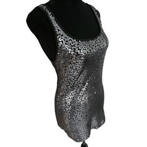 Old Navy sequin front gray tank top, size M. Dark gray tank with tonal gray sequins. Cotton polyester blend. Approximate measurements are pit to pit flat 15”, stretchy, length from shoulder approximately 27”.