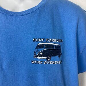 Features: Front has a small graphic on the chest of a VW bus. Reads "Surf Forever, Work Whenever." Back has a larger graphic of the bus with surf boards on top and the same slogan. "Old Orchard Beach, ME" in the middle.