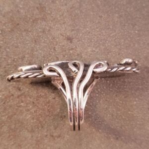 One of a kind, unique old Pawn Navajo organic deep green three freeform shaped cabochon bezel set turquoise ring with curled split side shank band. Very cool organic boho piece! This ring has been tested and confirmed as sterling silver.